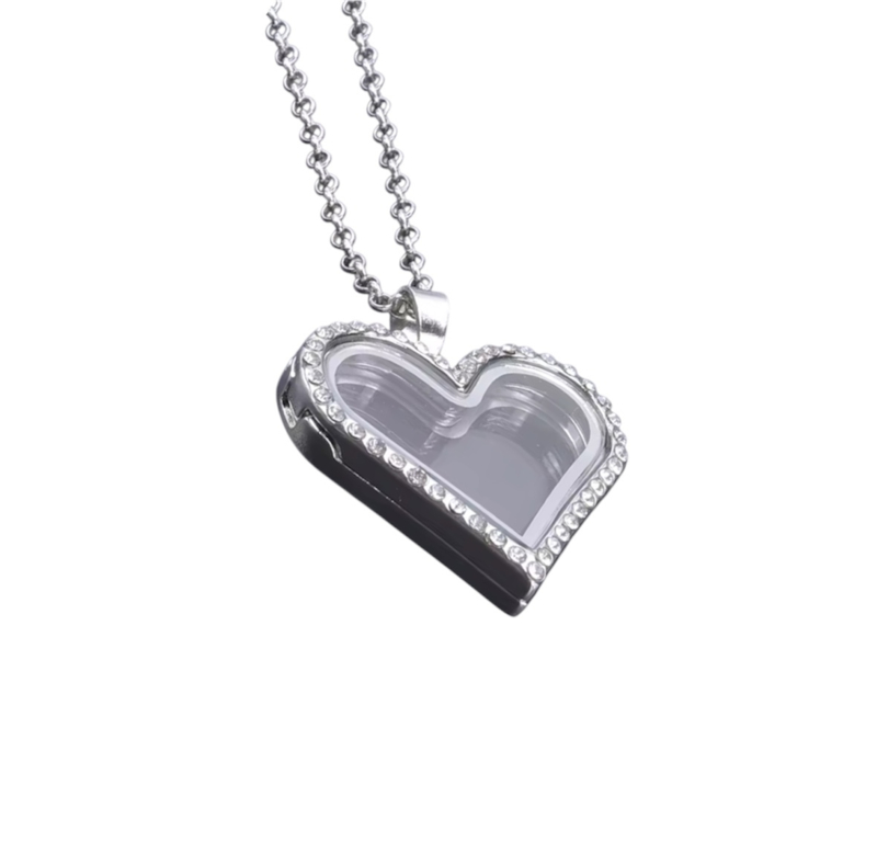 Overzichtfijne Jasseron ketting met een hart om jouw herinneringen in te bewaren. Het hartje zit vol glinstering door de swarovski stenen. Je kunt het hartje openvouwen om de hanger te vullen met jouw bedels. Hij sluit met magneten.