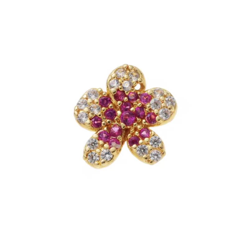 Mooie bloem met roze en witte zirkonia steentjes erin. De basis is goudkleurig.