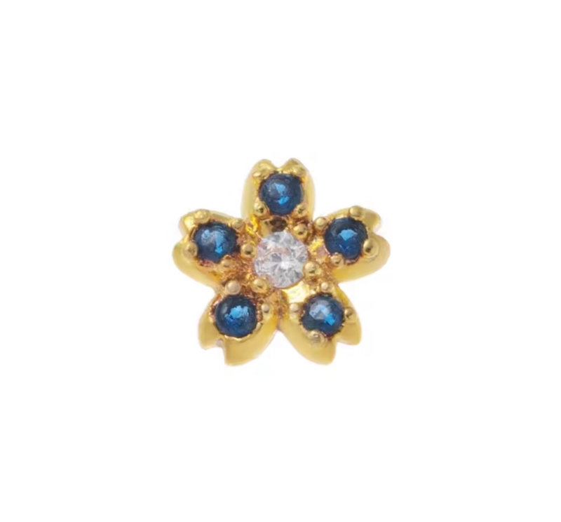 Super schattige kleine bloem met blauwe en witte zirconia steentjes. De basis is goudkleurig.